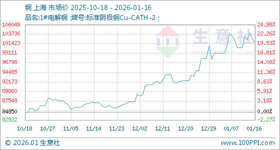 1月16日,生意社铜基准价为102551.67元/吨,与本月初(99180.00元/吨)相比,上涨了3.40%。