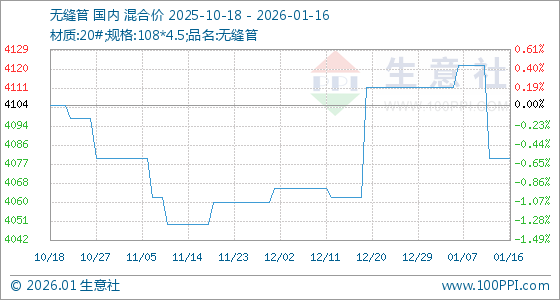 1月16日,生意社无缝管基准价为4080.00元/吨,与本月初(4112.00元/吨)相比,下降了0.78%。