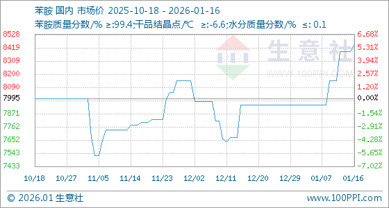 1月16日,生意社苯胺基准价为8387.50元/吨,与本月初(7945.00元/吨)相比,上涨了5.57%。