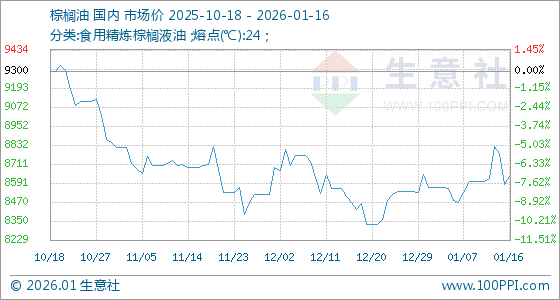 1月16日,生意社棕榈油基准价为8580.00元/吨,与本月初(8564.00元/吨)相比,上涨了0.19%。