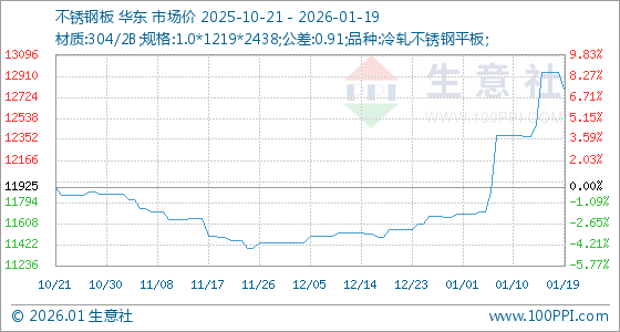 1月19日,生意社不锈钢板基准价为12941.67元/吨,与本月初(11691.67元/吨)相比,上涨了10.69%。