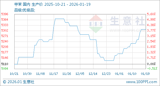 1月19日,生意社甲苯基准价为5310.00元/吨,与本月初(5170.00元/吨)相比,上涨了2.71%。