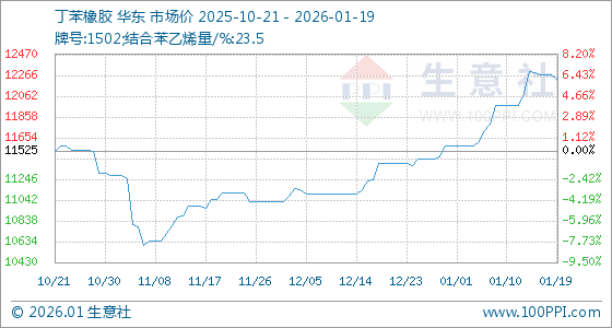 1月19日,生意社丁苯橡胶基准价为12266.67元/吨,与本月初(11575.00元/吨)相比,上涨了5.98%。