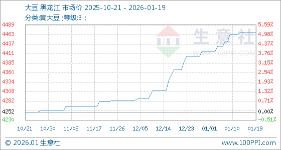 1月19日,生意社大豆基准价为4468.00元/吨,与本月初(4416.00元/吨)相比,上涨了1.18%。