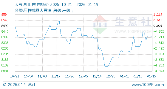 1月19日,生意社大豆油基准价为8402.00元/吨,与本月初(8256.00元/吨)相比,上涨了1.77%。