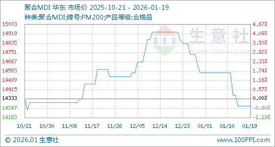 1月19日,生意社聚合MDI基准价为14266.67元/吨,与本月初(14566.67元/吨)相比,下降了2.06%。