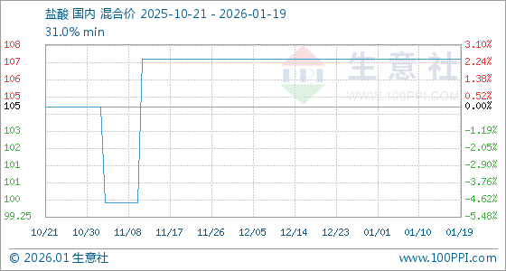 1月19日,生意社盐酸基准价为107.50元/吨,与本月初持平。