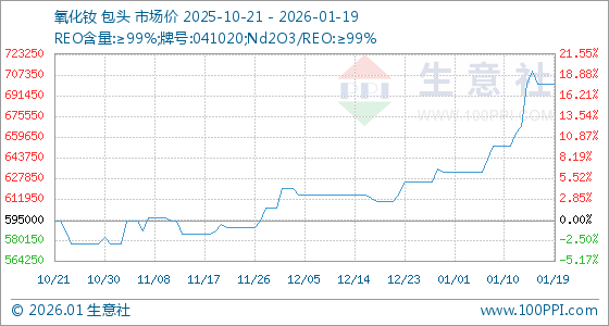1月19日,生意社氧化钕基准价为700000.00元/吨,与本月初(632500.00元/吨)相比,上涨了10.67%。
