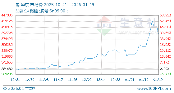 1月19日,生意社锡基准价为415230.00元/吨,与本月初(326340.00元/吨)相比,上涨了27.24%。