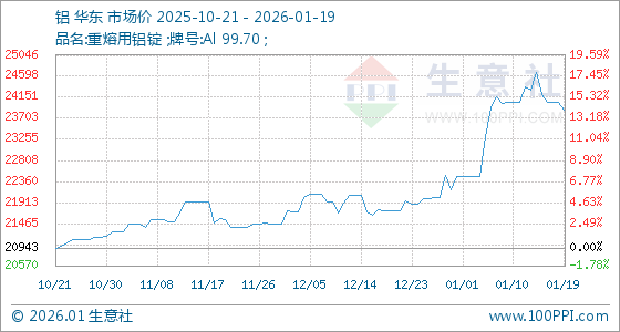 1月19日,生意社铝基准价为24045.00元/吨,与本月初(22473.33元/吨)相比,上涨了6.99%。