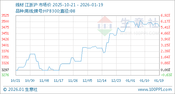 1月19日,生意社线材基准价为3492.50元/吨,与本月初(3500.00元/吨)相比,下降了0.21%。