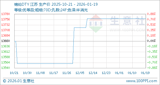 1月19日,生意社锦纶DTY基准价为13760.00元/吨,与本月初持平。