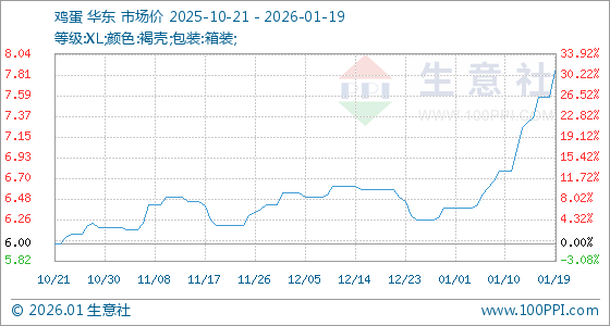 1月19日,生意社鸡蛋基准价为7.57元/公斤,与本月初(6.38元/公斤)相比,上涨了18.65%。