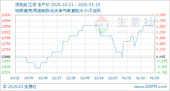 1月19日,生意社活性炭基准价为12866.67元/吨,与本月初(12766.67元/吨)相比,上涨了0.78%。