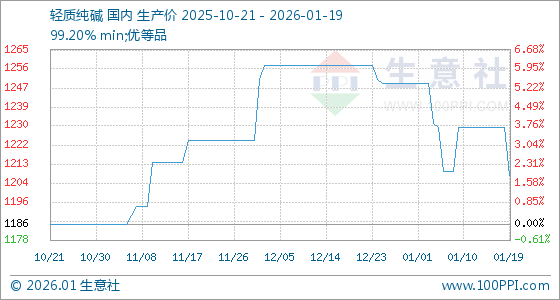 1月19日,生意社轻质纯碱基准价为1230.00元/吨,与本月初(1250.00元/吨)相比,下降了1.6%。
