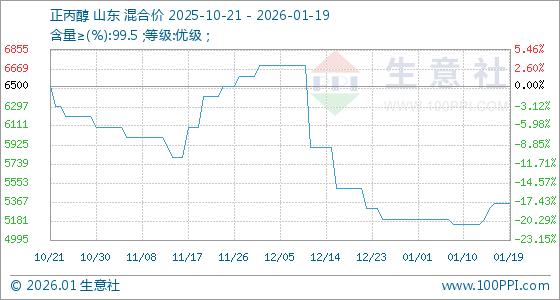1月19日,生意社正丙醇基准价为5350.00元/吨,与本月初(5200.00元/吨)相比,上涨了2.88%。