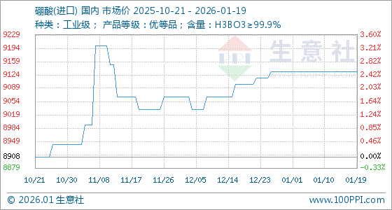 1月19日,生意社硼酸(进口)基准价为9133.33元/吨,与本月初持平。