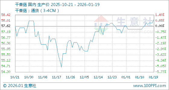 1月19日,生意社干香菇基准价为57.85元/公斤,与本月初(57.64元/公斤)相比,上涨了0.36%。