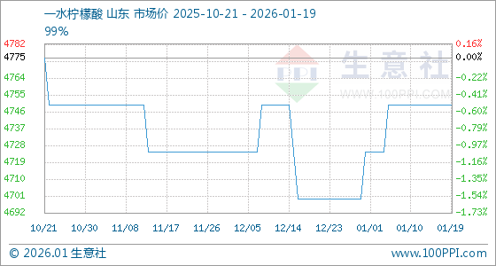 1月19日,生意社一水柠檬酸基准价为4750.00元/吨,与本月初(4725.00元/吨)相比,上涨了0.53%。
