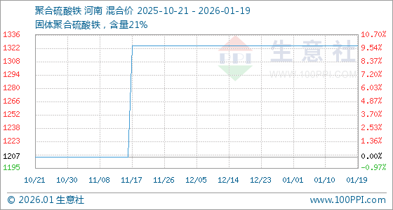 1月19日,生意社聚合硫酸铁基准价为1325.00元/吨,与本月初持平。