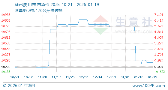 1月19日,生意社环己胺基准价为10266.67元/吨,与本月初(10766.67元/吨)相比,下降了4.64%。