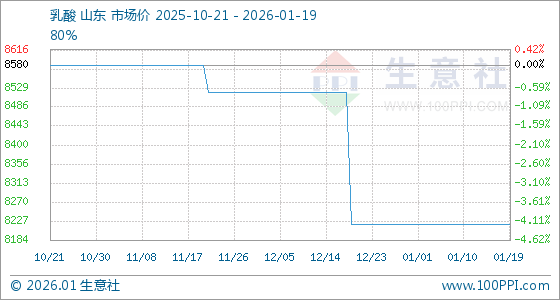 1月19日,生意社乳酸基准价为8220.00元/吨,与本月初持平。
