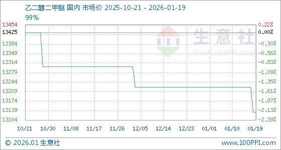 1月19日,生意社乙二醇二甲醚基准价为13133.33元/吨,与本月初(13225.00元/吨)相比,下降了0.69%。