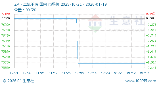 1月19日,生意社2,4-二氯苯胺基准价为75500.00元/吨,与本月初持平。