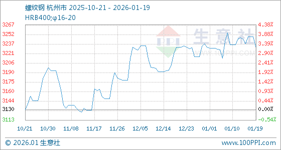 1月19日,生意社螺纹钢基准价为3248.50元/吨,与本月初(3232.00元/吨)相比,上涨了0.51%。