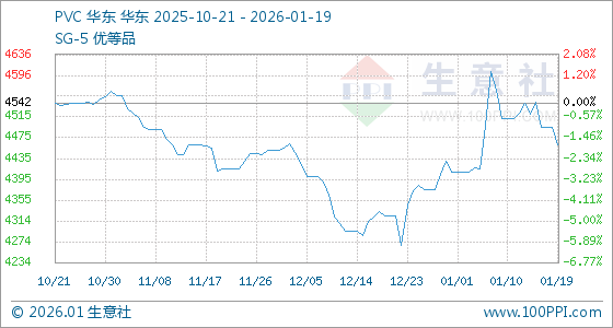 1月19日,生意社PVC基准价为4496.00元/吨,与本月初(4409.00元/吨)相比,上涨了1.97%。