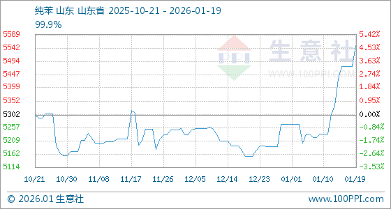 1月19日,生意社纯苯基准价为5476.67元/吨,与本月初(5268.67元/吨)相比,上涨了3.95%。