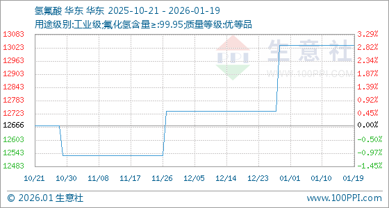 1月19日,生意社氢氟酸基准价为13033.33元/吨,与本月初持平。