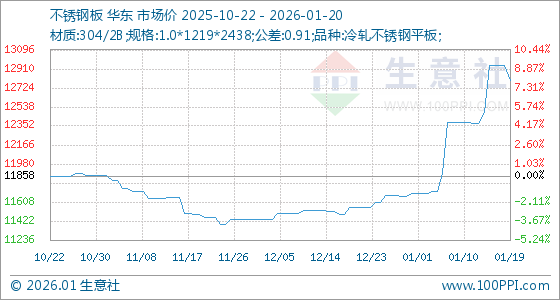 1月20日,生意社不锈钢板基准价为12800.00元/吨,与本月初(11691.67元/吨)相比,上涨了9.48%。
