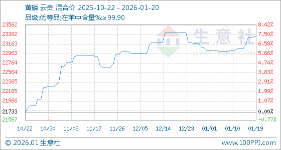 1月20日,生意社黄磷基准价为23326.67元/吨,与本月初(23033.33元/吨)相比,上涨了1.27%。