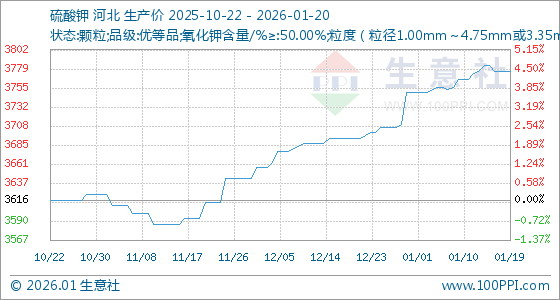 1月20日,生意社硫酸钾基准价为3776.67元/吨,与本月初(3750.00元/吨)相比,上涨了0.71%。