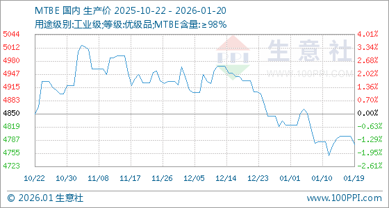 1月20日,生意社MTBE基准价为4776.67元/吨,与本月初(4823.33元/吨)相比,下降了0.97%。