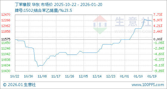 1月20日,生意社丁苯橡胶基准价为12225.00元/吨,与本月初(11575.00元/吨)相比,上涨了5.62%。