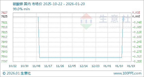 1月20日,生意社碳酸钾基准价为7825.00元/吨,与本月初(7800.00元/吨)相比,上涨了0.32%。
