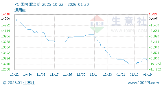 1月20日,生意社PC基准价为13133.33元/吨,与本月初(13200.00元/吨)相比,下降了0.51%。