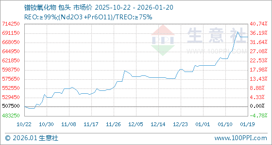 1月20日,生意社镨钕氧化物基准价为682500.00元/吨,与本月初(610000.00元/吨)相比,上涨了11.89%。