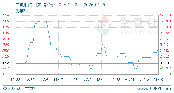 1月20日,生意社二氯甲烷基准价为1775.00元/吨,与本月初(1697.50元/吨)相比,上涨了4.57%。