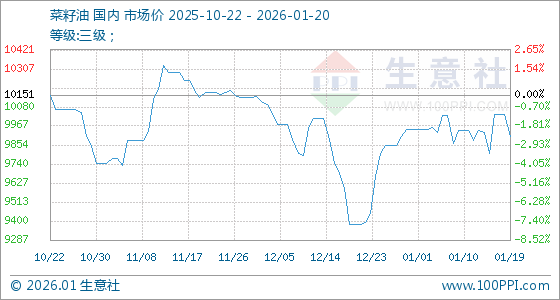 1月20日,生意社菜籽油基准价为9906.00元/吨,与本月初(9948.33元/吨)相比,下降了0.43%。