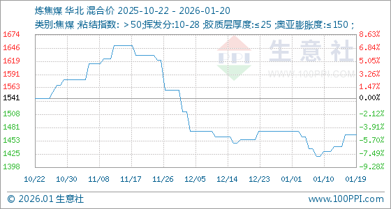 1月20日,生意社炼焦煤基准价为1466.25元/吨,与本月初(1473.75元/吨)相比,下降了0.51%。