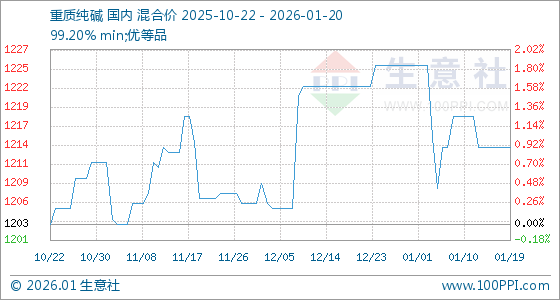 1月20日,生意社重质纯碱基准价为1214.29元/吨,与本月初(1225.71元/吨)相比,下降了0.93%。