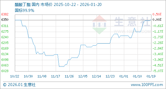 1月20日,生意社醋酸丁酯基准价为6352.50元/吨,与本月初(6250.00元/吨)相比,上涨了1.64%。