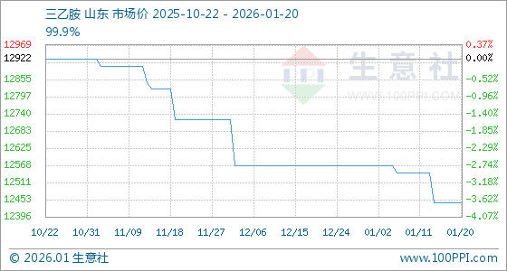 1月20日,生意社三乙胺基准价为12444.44元/吨,与本月初(12566.67元/吨)相比,下降了0.97%。