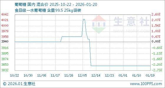 1月20日,生意社葡萄糖基准价为3850.00元/吨,与本月初持平。