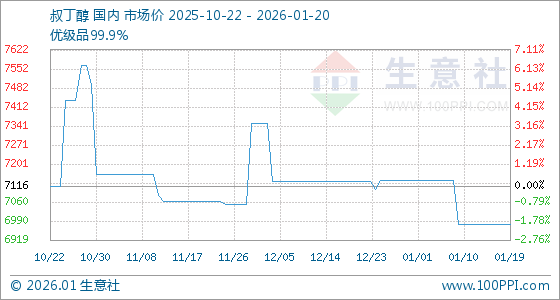 1月20日,生意社叔丁醇基准价为6978.57元/吨,与本月初(7141.67元/吨)相比,下降了2.28%。