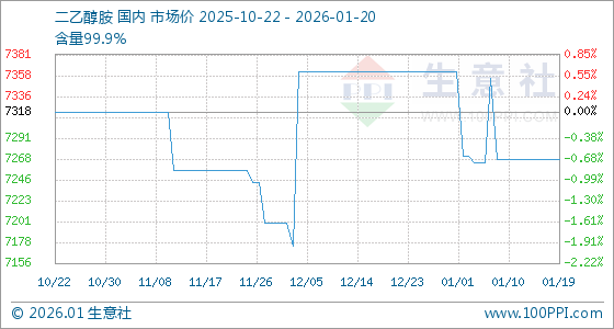 1月20日,生意社二乙醇胺基准价为7268.75元/吨,与本月初(7362.50元/吨)相比,下降了1.27%。