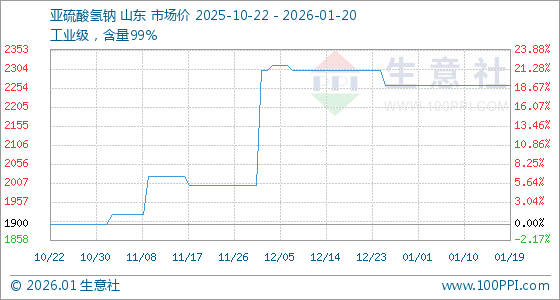 1月20日,生意社亚硫酸氢钠基准价为2262.50元/吨,与本月初持平。